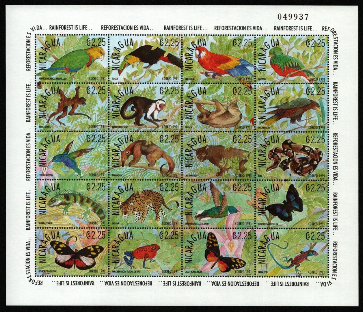 Nicaragua 1991 - Mi-Nr. 3089-2108 ** - MNH - ZD-Bogen - Wildtiere / Wild animals