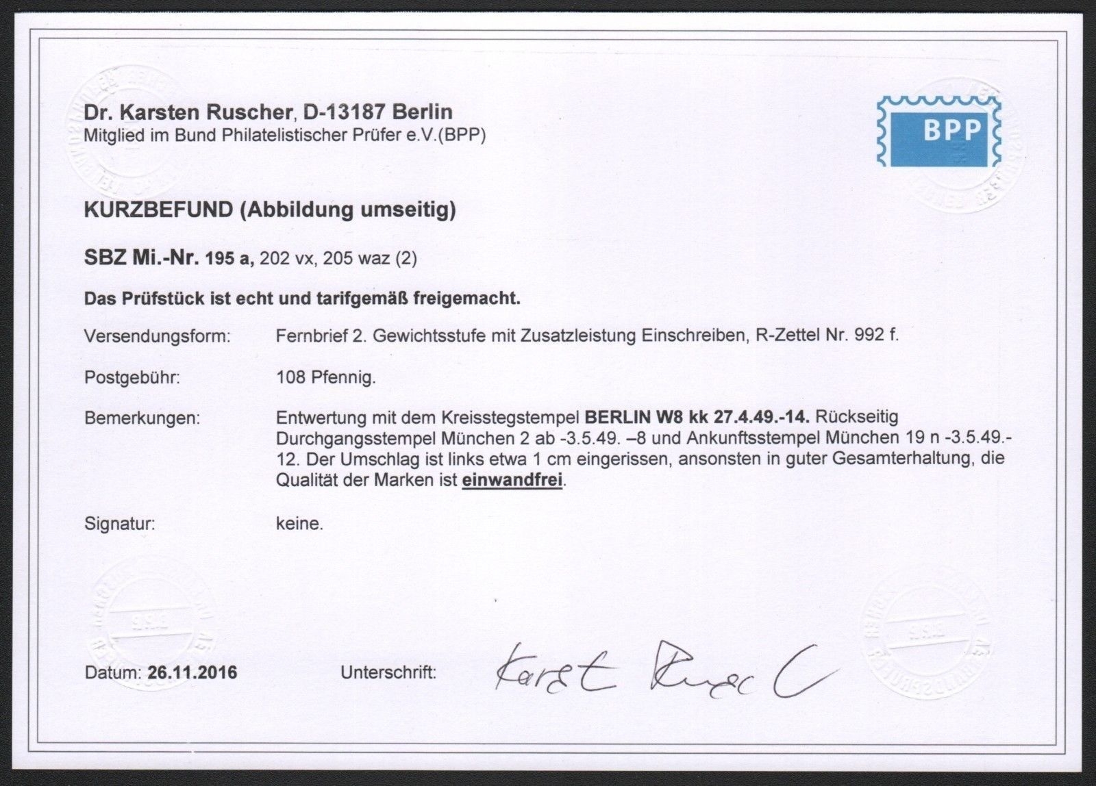 SBZ - Mi-Nr. 195 a, 202 vx, 205 waz (2) - Fernbrief - BPP geprüft